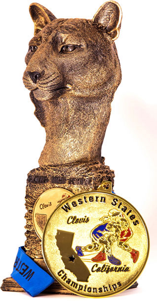 The champion at each weight class in each division will receive a 15 inch resin cougar head statue (pictured below). Each statue is engraved with "Western States Wrestling Championships" and has a 2 inch medal embedded in the base. 1st-6th place winners will receive 5" custom medals (also pictured below).
